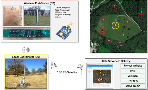 Each sensor measures soil moisture at a point, to scale these estimates up to a regional level hydrological models, which incorporate additional data (soil type, topography, precipitation etc.,) to produce local scale estimates of soil moisture.